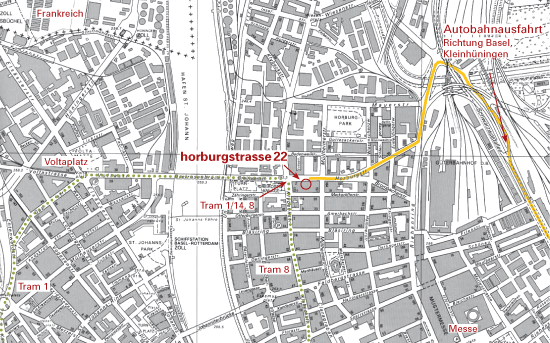 von der Autobahn A2 kommend Richtung Deutschland halten, Ausfahrt „Basel Nord / Kleinhüningen, France“ nehmen, in einer grossen Linkskurve Richtung St. Johann / Dreirosenbrücke